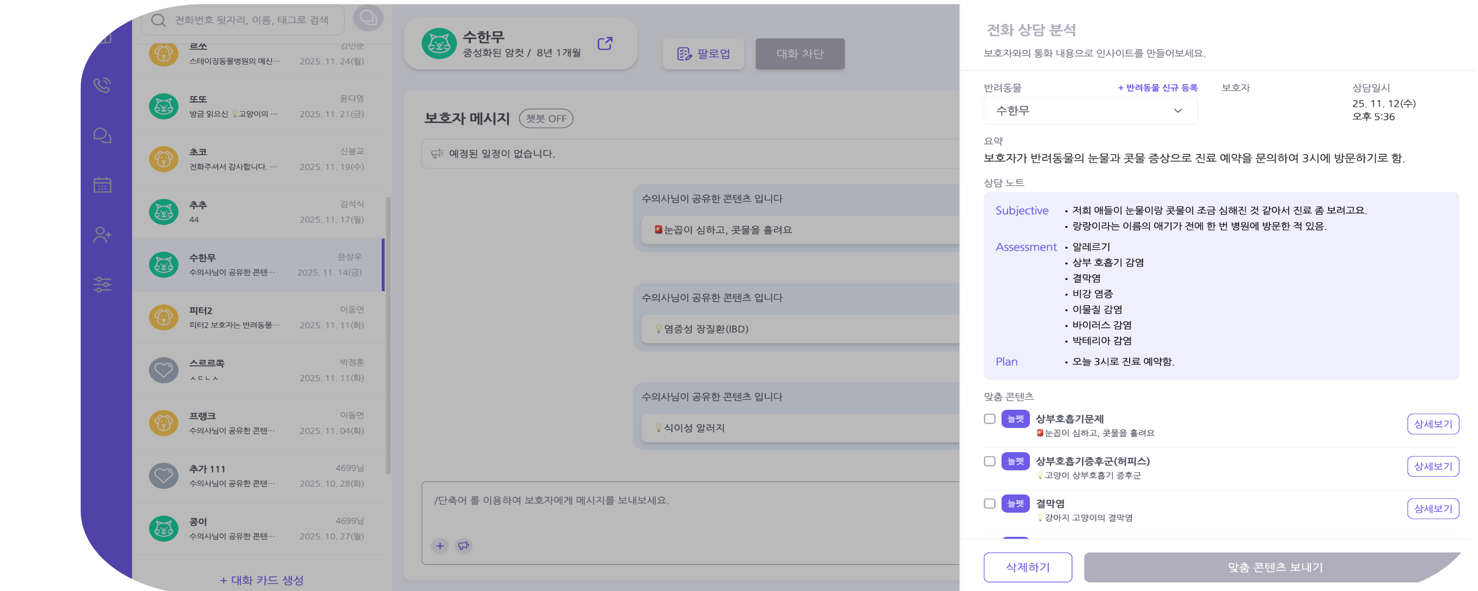 - A (Assessment - 평가): '상부 호흡기 감염 의심', '결막염', '알레르기' 등 통화 내용에서 유추할 수 있는 증상 키워드를 AI가 추출합니다.