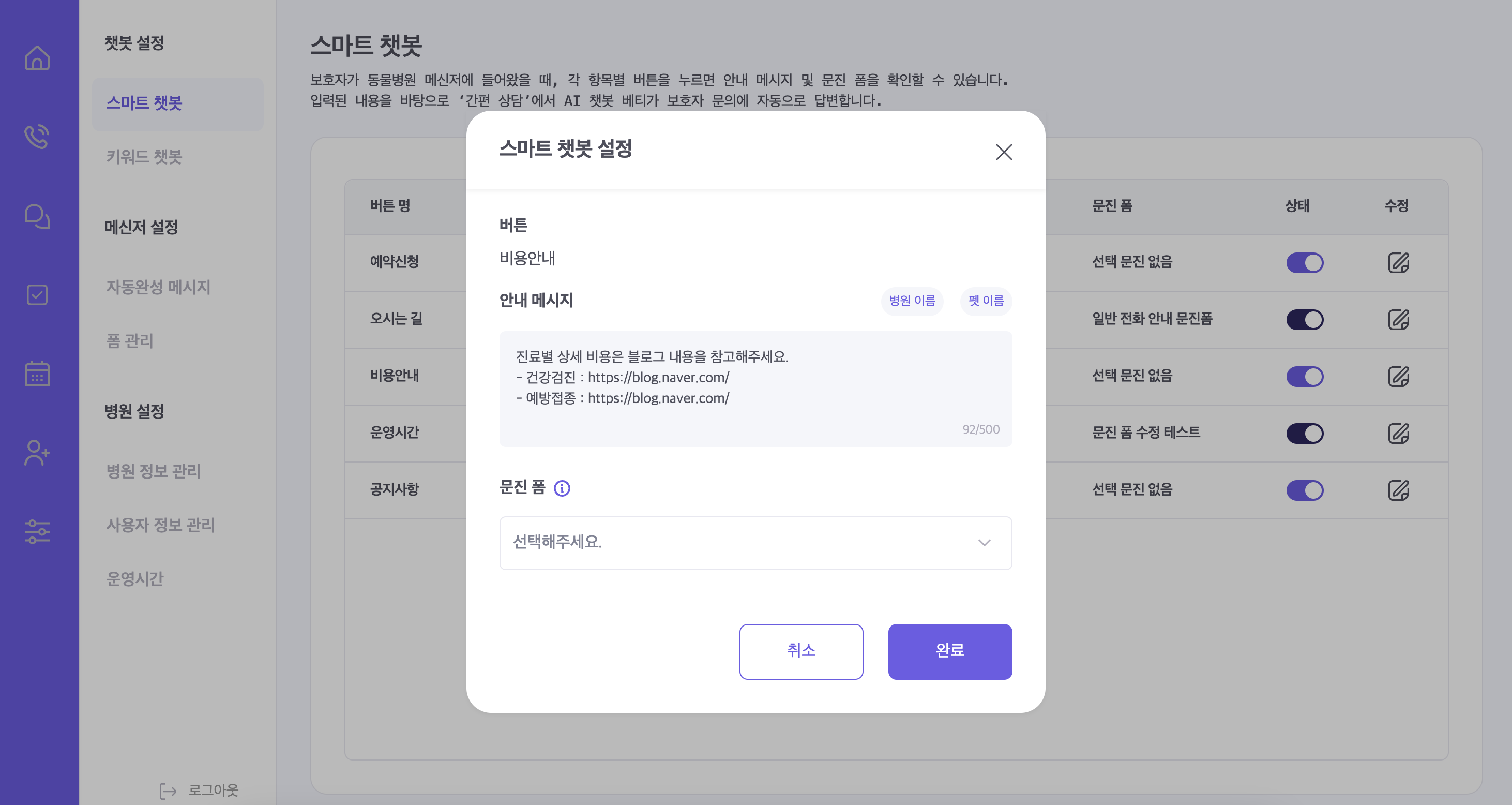 이제 '스마트 챗봇' 설정에 입력해두신 병원 정보를 바탕으로,
