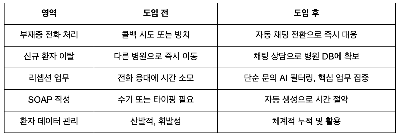 도입 병원들은 신규 환자 이탈이 크게 감소했으며, 리셉션 직원의 단순 응대 업무가 줄어들어 핵심 업무에 집중할 수 있게 되었습니다.