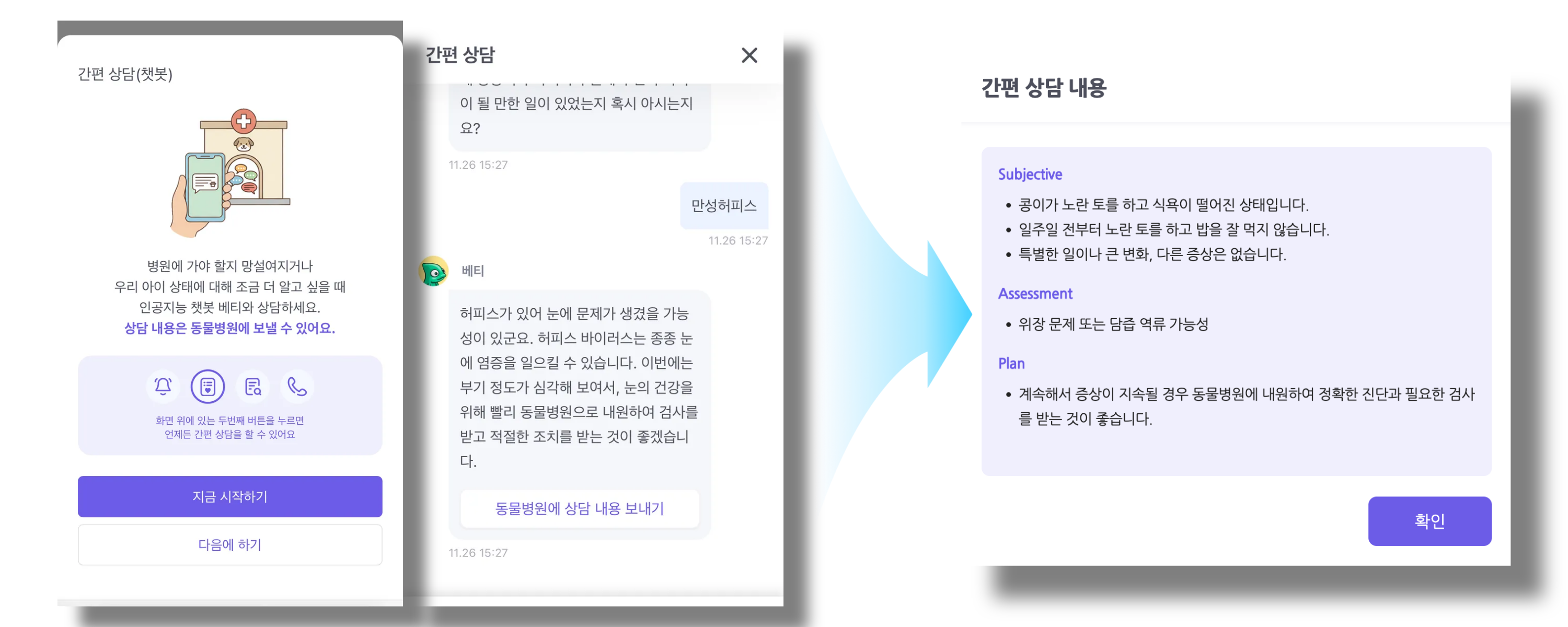 보호자가 '병원에 전송하기'를 동의하면, 이 채팅 내용 역시 SAP 형식의 깔끔한 리포트로 변환되어 병원 차트에 꽂힙니다.