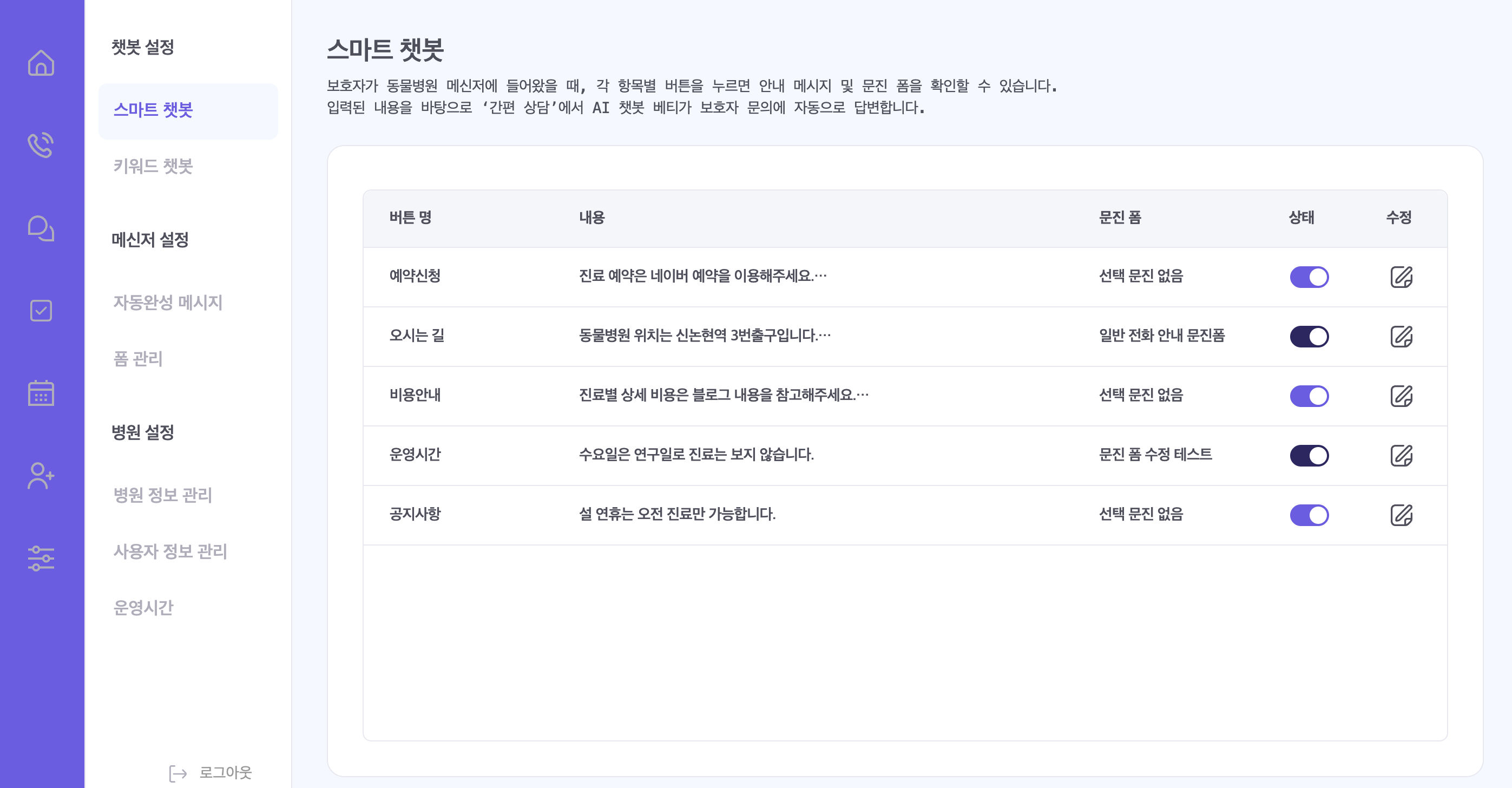 이제 '스마트 챗봇' 설정에 입력해두신 병원 정보를 바탕으로,
