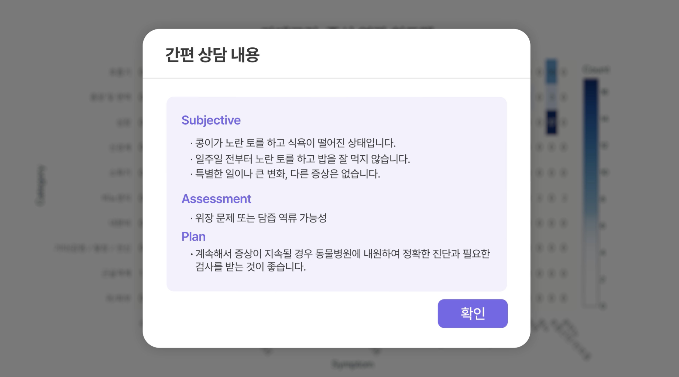 전화 상담 후 수의사가 직접 차트를 작성할 필요가 없습니다. 통화 내용이 자동으로 텍스트화되고, AI가 이를 분석해 SOAP 노트 형식으로 정리합니다.